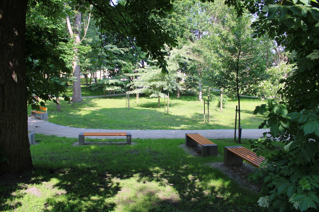 - wycinkę 8 drzew ze względu na ich chorobę wraz z działaniami kompensującymi, tj. nasadzeniem równowartości nowych drzew, wysiewem trawników i łąki kwietnej, lokalizację kompozycji rabat i kwietników